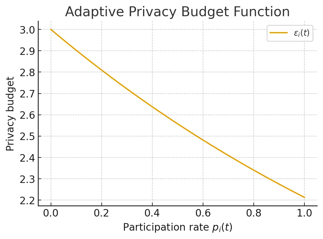 적응형 프라이버시 예산 함수: $\varepsilon_i(t) = \varepsilon_{\text{base}} \times \Bigl( 1 + \alpha \, e^{-\beta \, p_i(t)} \Bigr)$ 수식으로 참여율에 반비례하는 예산 할당
